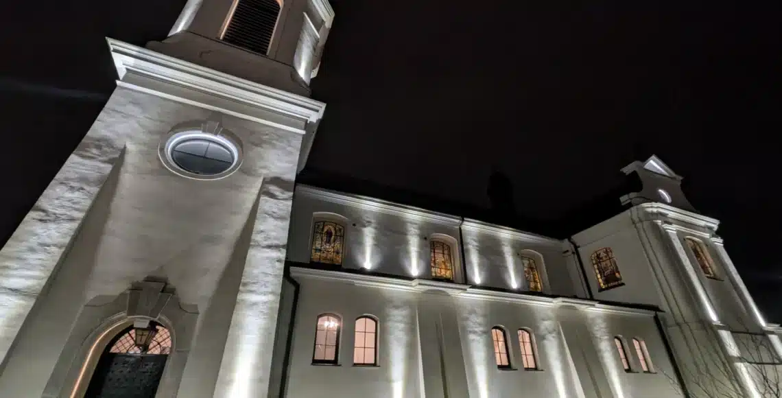 - iluminację fasady kościoła – precyzyjne podświetlenie bryły, wież oraz wybranych elementów architektonicznych, które nadaje świątyni wyrazistość i rangę w nocnym krajobrazie miasta,