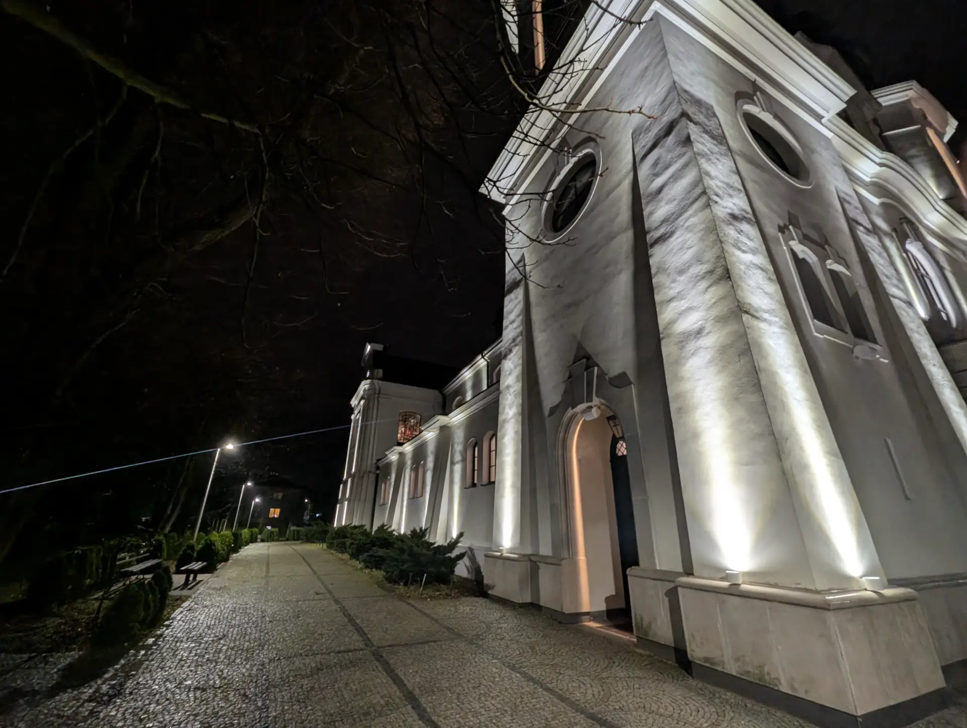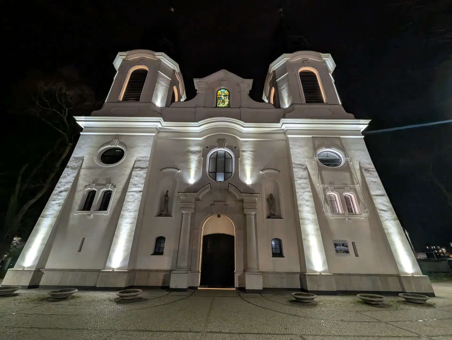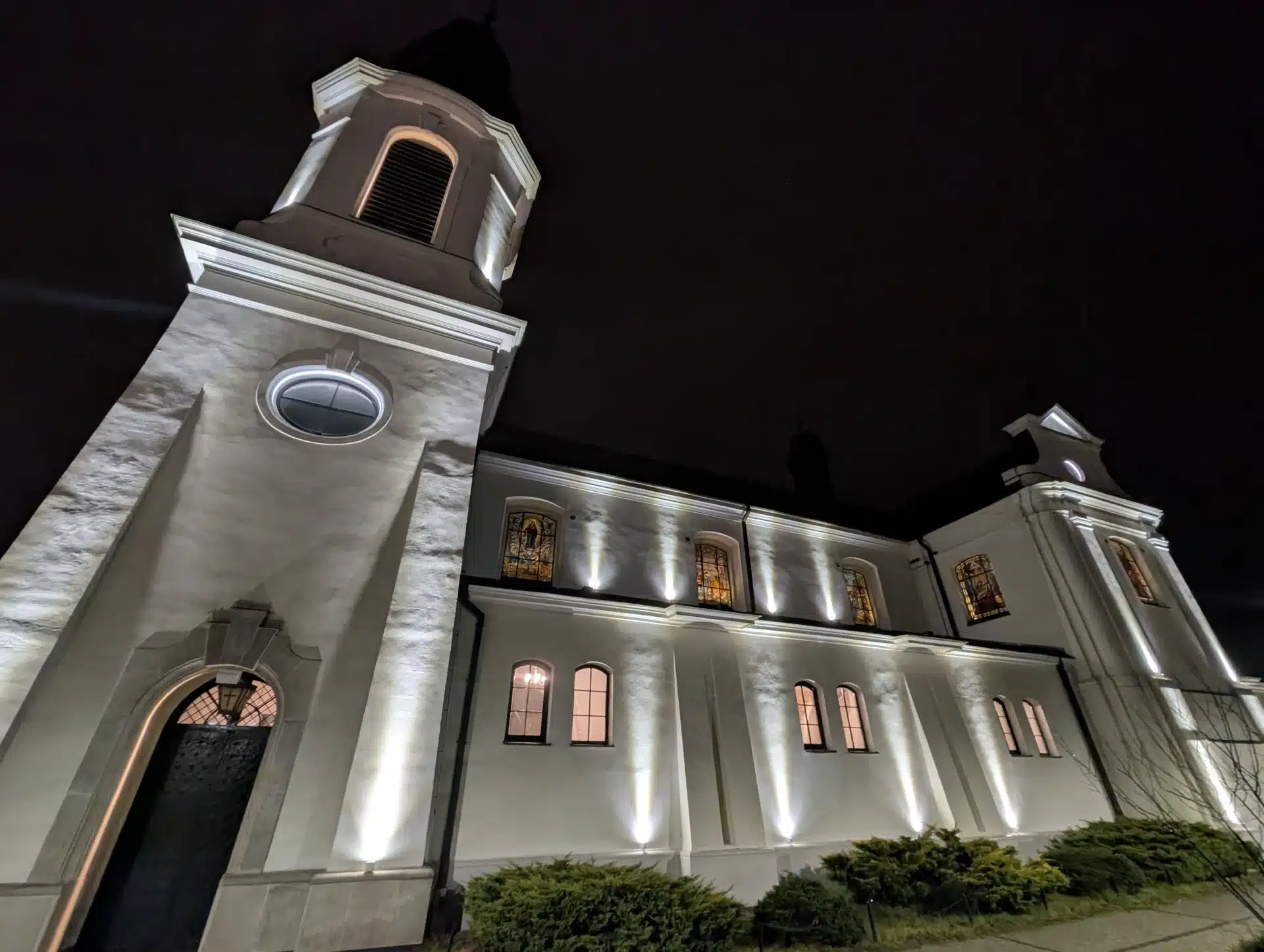 • iluminację fasady kościoła – precyzyjne podświetlenie bryły, wież oraz wybranych elementów architektonicznych, które nadaje świątyni wyrazistość i rangę w nocnym krajobrazie miasta,